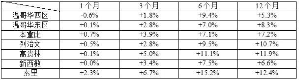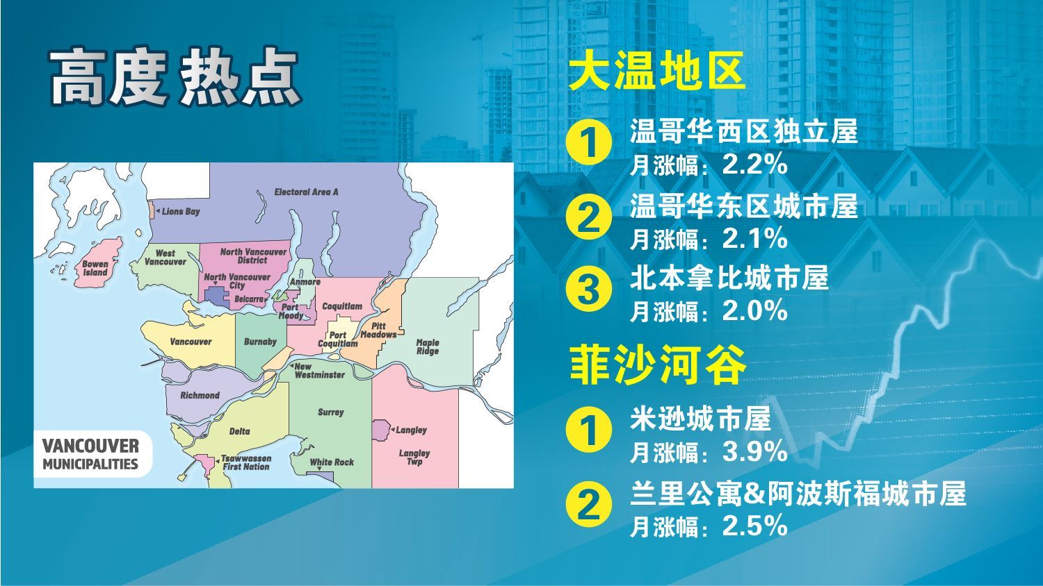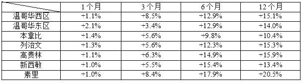 市场热点:有几个城区/社区是过去一个月内市场的热点,温哥华西区的独立屋市场一个月内上涨了2.2%;温哥华东区的城市屋市场,过去一个月内上涨了2.1%;北本那比的城市屋市场,一个月内上涨了2.0%。菲沙河谷的Mission的城市屋市场最近2个月一直疯狂,5月份1个月内狂涨了4.7%,6月份上涨了3.9%。
