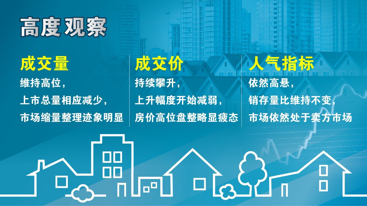 市场价格在持续上扬,6月份的升幅已经减弱,成交量和上市量都在递减,表面上是高位盘整,实际上是市场需要缓冲和平衡。诸位应客观理性地分析市场,豁达开放地看待升跌。未来几个月的市场将保持着一定的惯性,缓冲之后应当再创辉煌。
