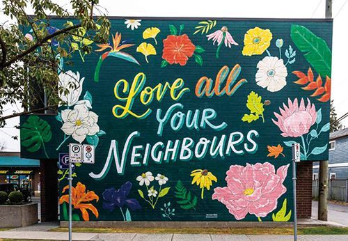 原义取于圣经,《爱你所有的邻居》是温哥华一位华裔年轻女艺术家在2020年温哥华壁画节期间创作的一件壁画作品。