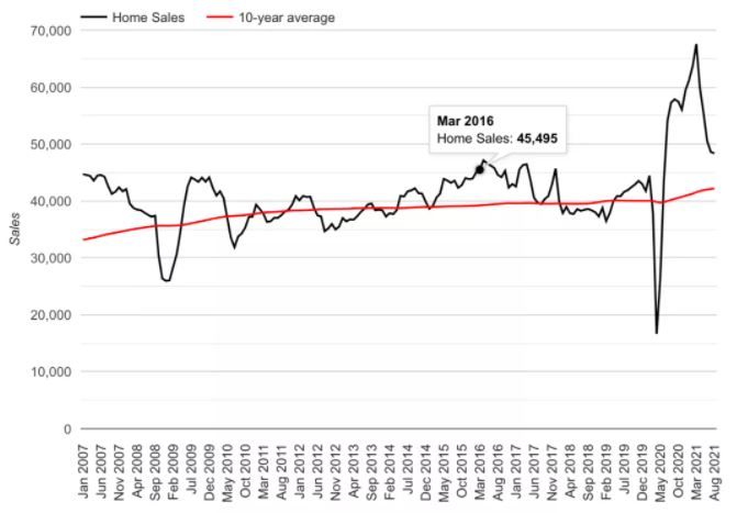 房市不同于股市,住宅并不是变现能力很强的资产,成交量也不应该上窜下跳。但加拿大住宅成交量自2020年5月触底后,仅用了十个月就创造历史新高,而且远远高于历史上任何一个地产狂热时期。月度成交量最高逼近7万套,而上一次地产市场的高潮2016年3月,月度成交量也不过45495套。