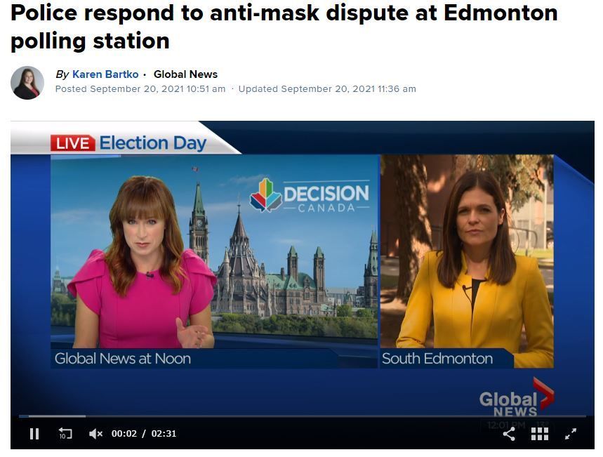 阿尔伯塔省埃德蒙顿市的一处投票点,一男一女因为拒绝戴口罩和工作人员发生冲突,警察赶到后,这两人离开了投票站。