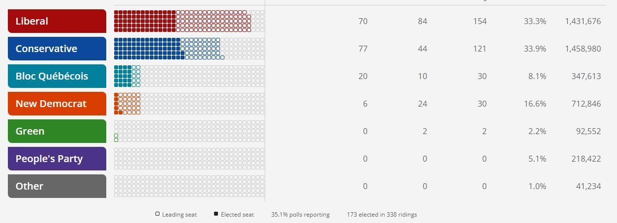 纽芬兰和拉布拉多省的投票将在4点结束,是加拿大最早结束投票的省份。开票结果将陆续公布。