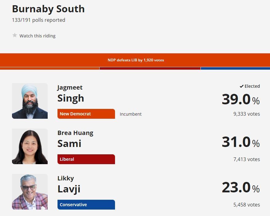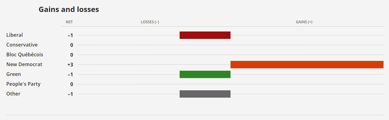 NDP多赢的3席,一席来自自由党,一席源于王州迪的弃选,一席来自温哥华岛绿党失去的一个选区。