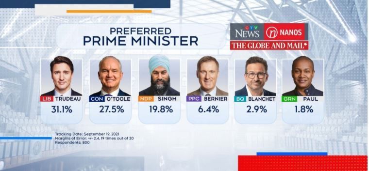 自由党党领特鲁多、保守党党领奥图尔、魁北克集团党领布兰切特均赢下各自所在选区。绿党党领Annamie Paul和人民党党领卞聂尔落选,新民主党党领驵勉诚形势焦灼,领先优势极小。