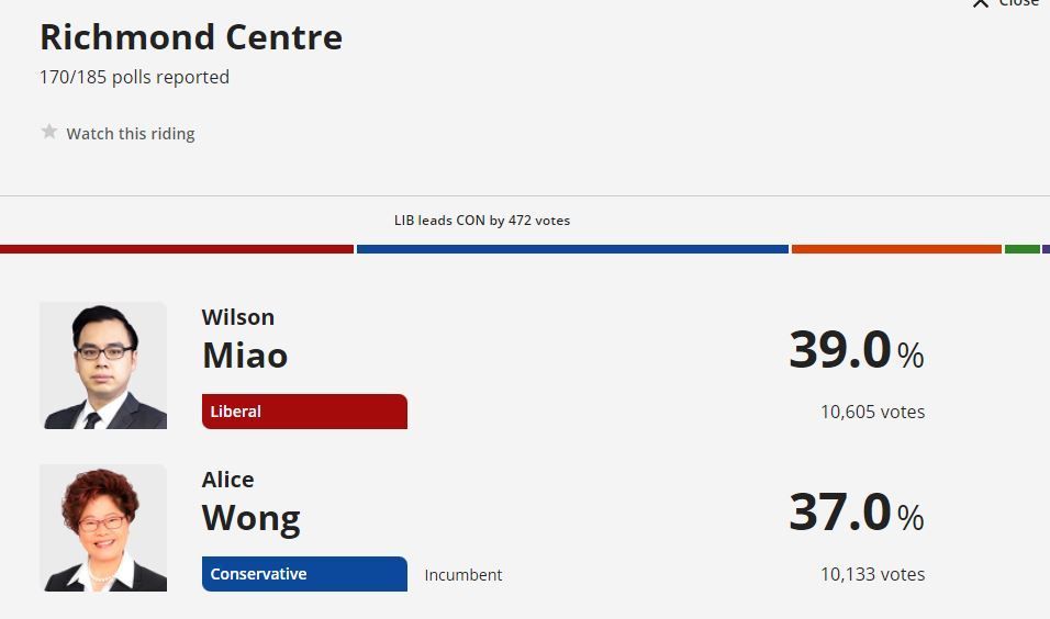 列治文中心选区的选情也十分胶着。