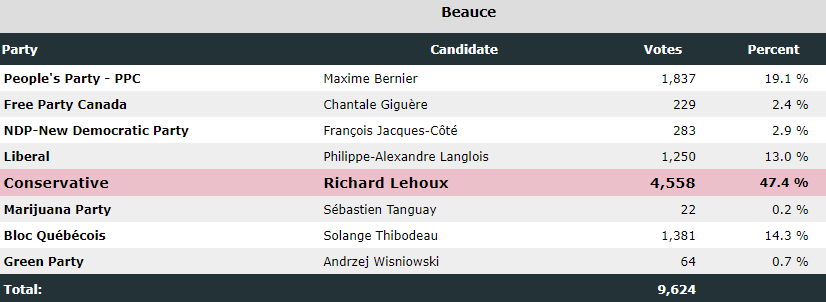 人民党党领卞聂尔(Maxime Bernier)再次在自己所在的Beauce选区中落败,输给了保守党候选人Richard Lehoux。