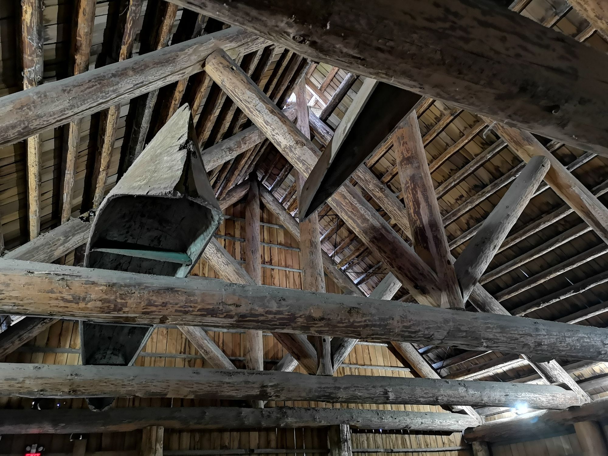 长屋外貌及屋内梁上扣着的独木舟(由作者提供)