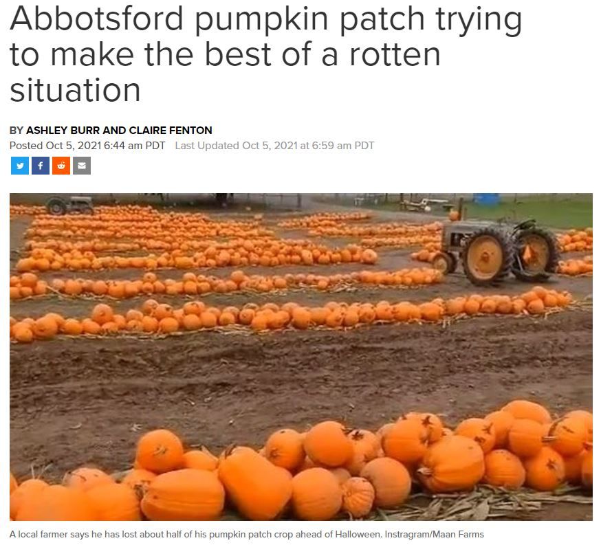 据CTV新闻报道,万圣节未至,但阿伯斯福一南瓜农场半数南瓜已腐烂。