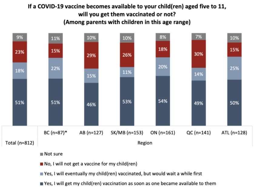 9月29日至10月3日,Angus Reid Institute通过网络对5,011名加拿大人进行了调查。民调显示,和成年人接种率分部情况类似,不同省份儿童接种的意愿也有差别。卑诗省、安省和大西洋地区只有15%的家长表示不会让5-11岁的孩子接种疫苗,但阿省、萨省和魁省,有30%的家长不会让孩子接种。
