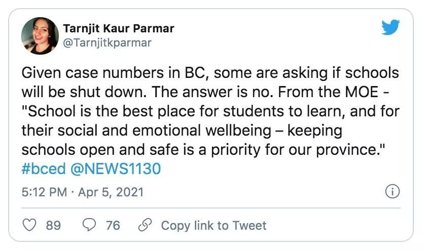 面对众多家长的问询和质疑,BC省教育厅厅长在6号星期二发布声明,声明中说了这样一段话:“保持学校的安全和开放是省府当前的优先事项。”(keeping schools open and safe is a priority for our province)