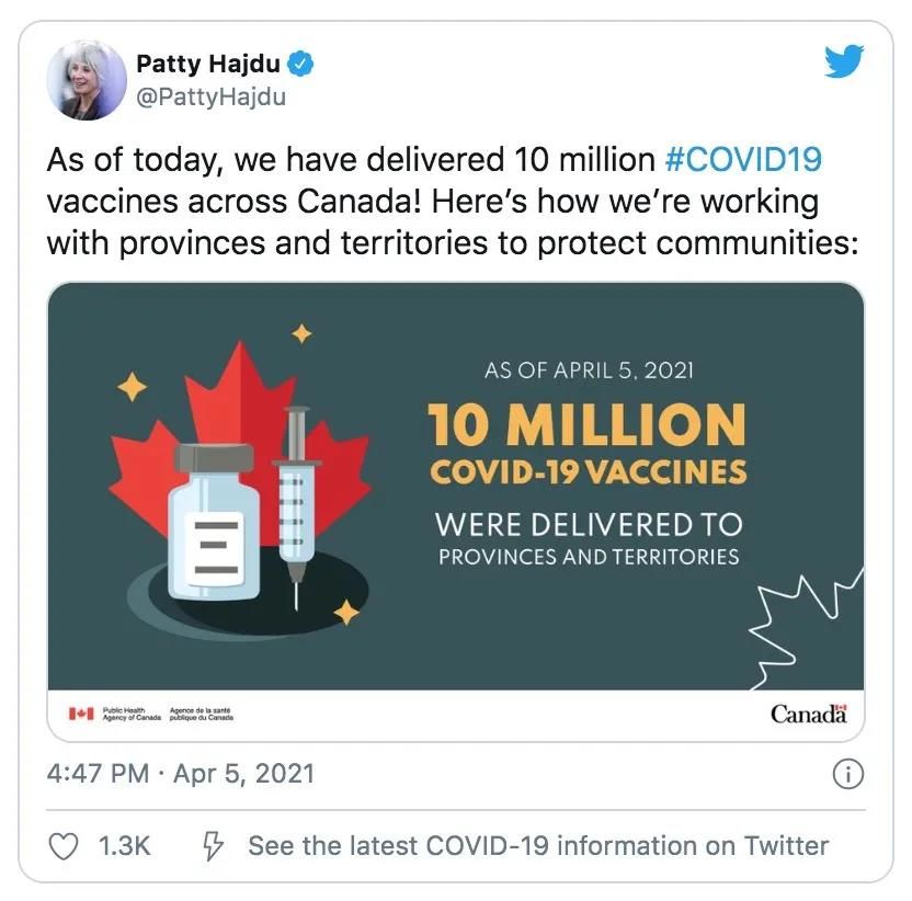 加拿大卫生部长帕蒂·海杜6号宣称全加拿大到目前为止已累计接收了近1000万剂新冠疫苗。