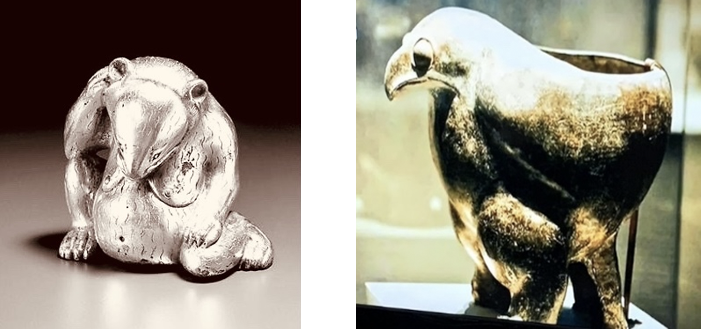 约5500年红山文化的玉雕陶器。以及距今约4200 -- 5200年新石器时期良渚文化的石雕玉器,都有鹰和熊作为主要题材的组合,形态各异,蔚为奇观,反映了鹰和熊古艺术与中华民族文化的深厚渊源。透过这些历史碎片,我们似乎穿越千年时光,看到远古的某个黑夜,先民们围着火堆,虔诚地举行祭祀仪式,火光中鹰和熊的图腾若隐若现 ……。