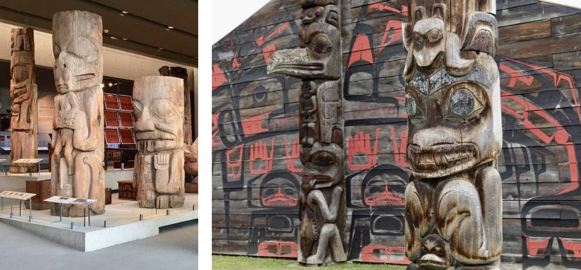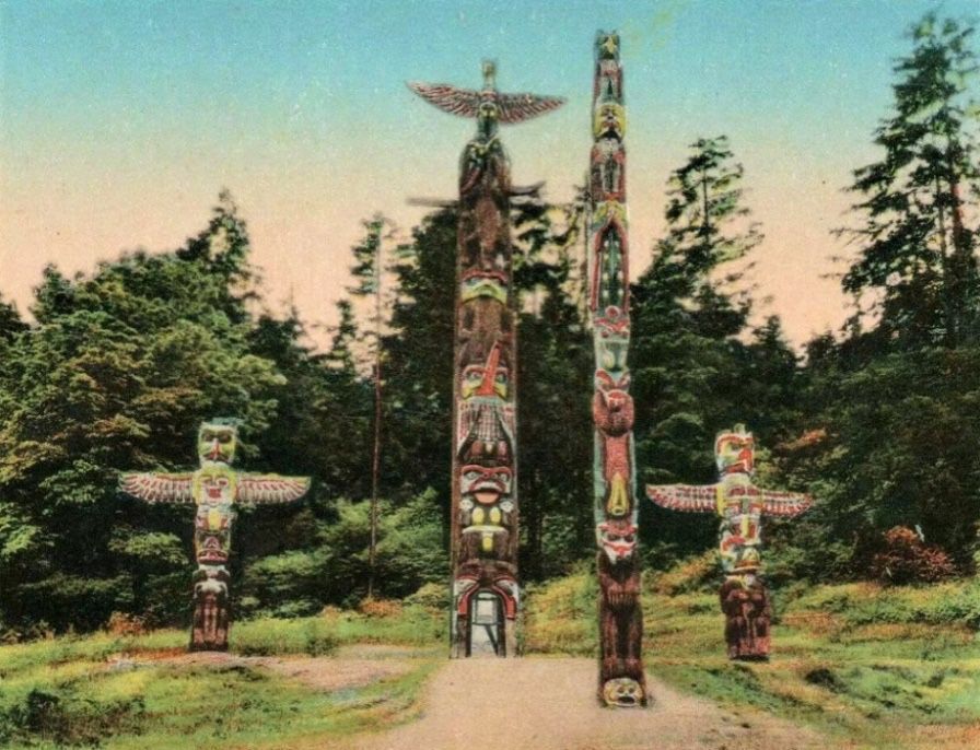 那些用鹰和熊等野生动物作为题材,并夸张变形雕成的图腾,鹰上熊下,顶天立地,傲视群雄。这些图腾似乎难以被人理解,但它是那些原住民用以祭神拜祖的一种独特符号。它有别于其它的艺术,有着一种古朴而神秘的气息,这些木雕图腾以静穆的造型语言,形象地表现了生灵对理想的热情追求,表达了土著原住民敬畏自然,崇拜神明的感情,它是北美西海岸土著民族古老文化的精髓。