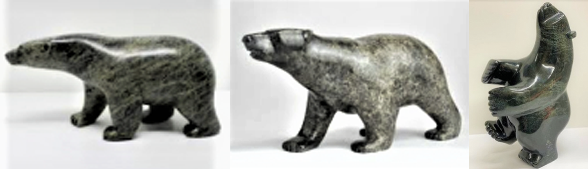 北极圈爱斯基摩人生活在极其严寒的自然环境里,在漫长的冬季,他们围着篝火,用一种 Soapstone 苏珀石,一刀一刻地表现他们最熟悉、最亲密的北极熊、海狗和海犳。他们司空见惯了北极熊的千姿百态和大雪的飘起落下,所以当再现和创作寒冷环境中生活栖息的北极熊时,他们会用特别夸张的造型手法,用熊的肢体语言来展现这一北极圈庞然大物热情豪放的生命活力。在他们手中的这些野生动物形态会变得手舞足蹈,石雕中加入了北方土著民族热情奔放的审美偏爱,他们大刀阔斧地雕凿动物形体,不拘泥于琐碎细节,追求形神中似与不似之间焕发出的生命激情和神韵。他们手中的动物石雕,动作幅度大,团块感觉强,刀法简约,粗犷朴素的造型中充分流露出土著民族对北极圈大自然伙伴由衷的敬畏。那种由雕刻传递出的信息,是对温暖的盼望,对生活的热情,对生命的赞美,令人看了感到热血沸腾。这是生活在远离北极地区人们所难以想象的,也是感到新奇和震撼的。然而,这正是石雕艺术在潜移默化中产生和发挥着视觉的移情作用,也是北美土著民族石雕文化特有魅力之所在。