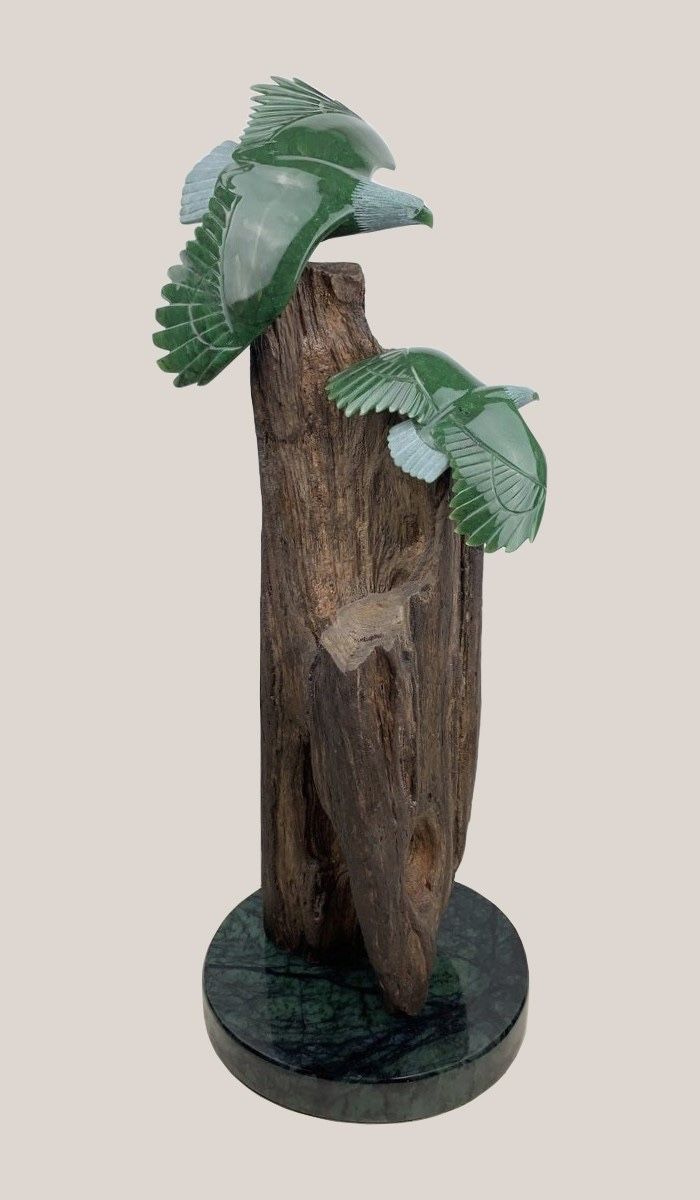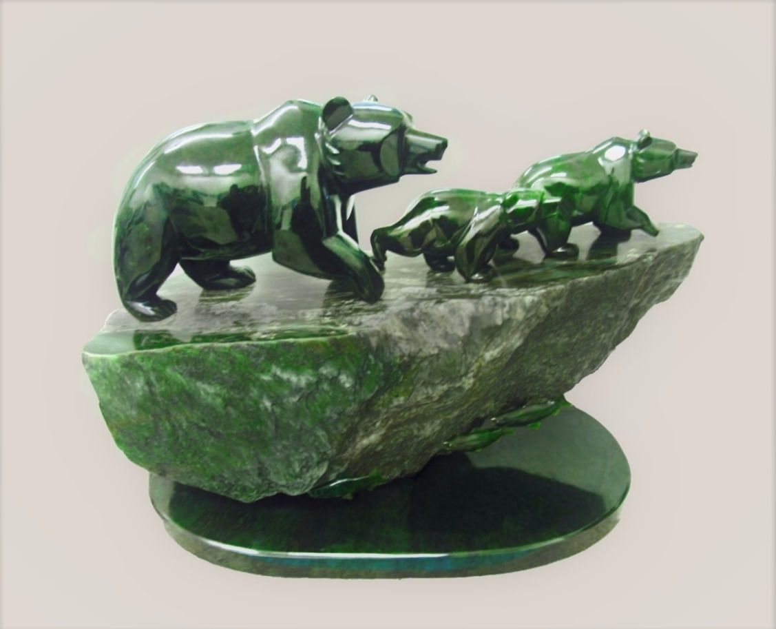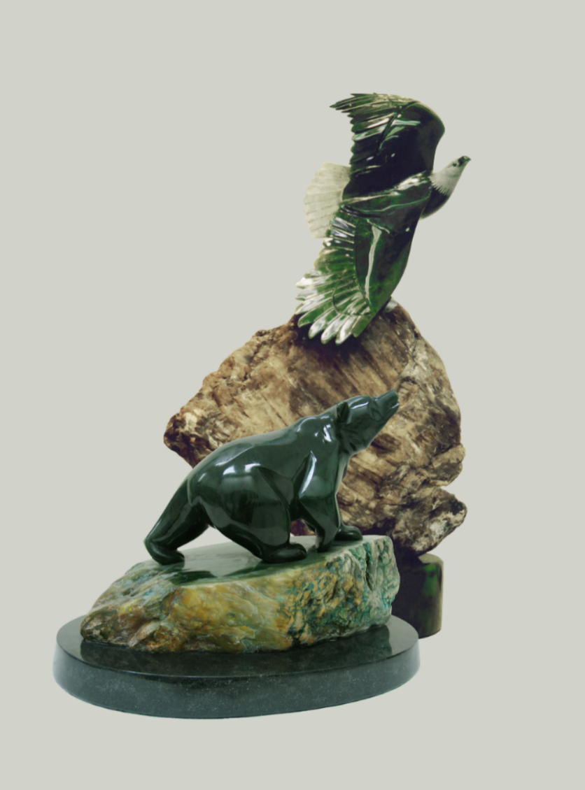加拿大玉雕用雄鹰和魁熊作为载体的艺术,富于鲜明独特的北美洲地域特色。加拿大鹰和熊玉雕通常选用加碧玉材,这一玉种石性坚硬,色感沉稳凝重,对雕刻雄鹰和魁熊这样粗犷形态相当匹配。在表现雄鹰和魁熊的雕刻中以刀代笔,写意画般地运用各种造型手段,通过概括洗练的艺术形态,尽显雄鹰魁熊雄浑大气的特征,展现它们的原生美态,特别揭示作品蕴含的立意和内容。使作品主体清晰醒目地出现在粗犷疏朗背景上,让人看了既有视觉美感,也有粗犷雄浑的力量感,并留有无限想象的空间。当玉雕表现翱翔蓝天的雄鹰,不仅表现它与众不同的形象特征,淡定的神情,特别的形态,更要表现它内在精神特征。用写意与抽象相兼手法,由简洁的形似入手,进而鲜明突岀地展现它独特的神似。虽不见眼睛,却炯炯有神。虽不见羽毛,却淋漓尽致。鹰的艺术再现不拘泥于精致的细节,重要的是运用恰当手法,充分表现鹰特别的神韵,写形仅仅是造型手法,传神入化才是艺术追求的高端境界。