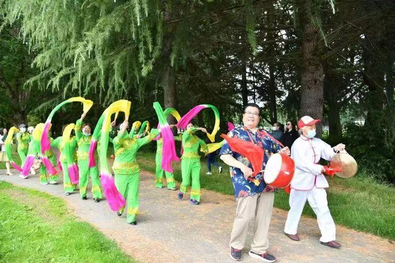 紧跟在谢老后面的举队牌者是 Allen Xie 博士,加航飞行员,是锣鼓乐队最年轻的队员。锣鼓队横幅后的大鼓手、领队崔仲先;主钞手、花钞手分别为队长助理应金宝和副队长董愉申,以及由秧歌舞队长高锦明领舞的 10 多位舞女,跳着欢乐长绸舞,精神抖擞,美丽壮观。