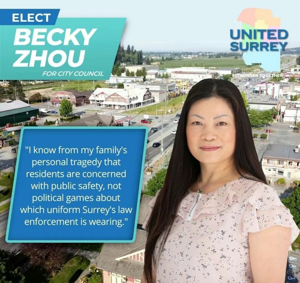 周凤棋 (Becky Zhou), 4年前就参选了素里市议员,独立参选获得了9000多票,作为独立参选人很不简单了。这次参选,被邀请加入素里最大热门当选团队,有很强的印度人背景,团队已经花费50万宣传款,素里印度人又超过50%,按理说,她这次当选可能性极大!