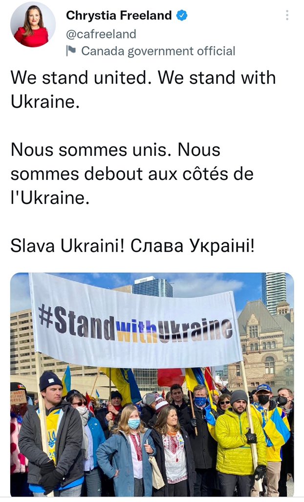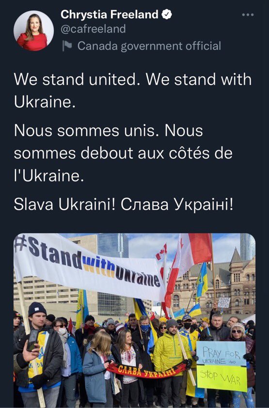 上周日,加拿大副总理方慧兰(Chrystia Freeland)参加了一场支持乌克兰的集会,她被拍到拿着一条红黑相间的围巾,上面写着乌克兰民族主义口号“Slava Ukraini”,而这个配色是班德拉运动(Bandera movement)的代表色,和一个与新纳粹主义有关的乌克兰极右翼运动息息相关,这引发了广泛的关注,许多加拿大人对此感到愤怒。