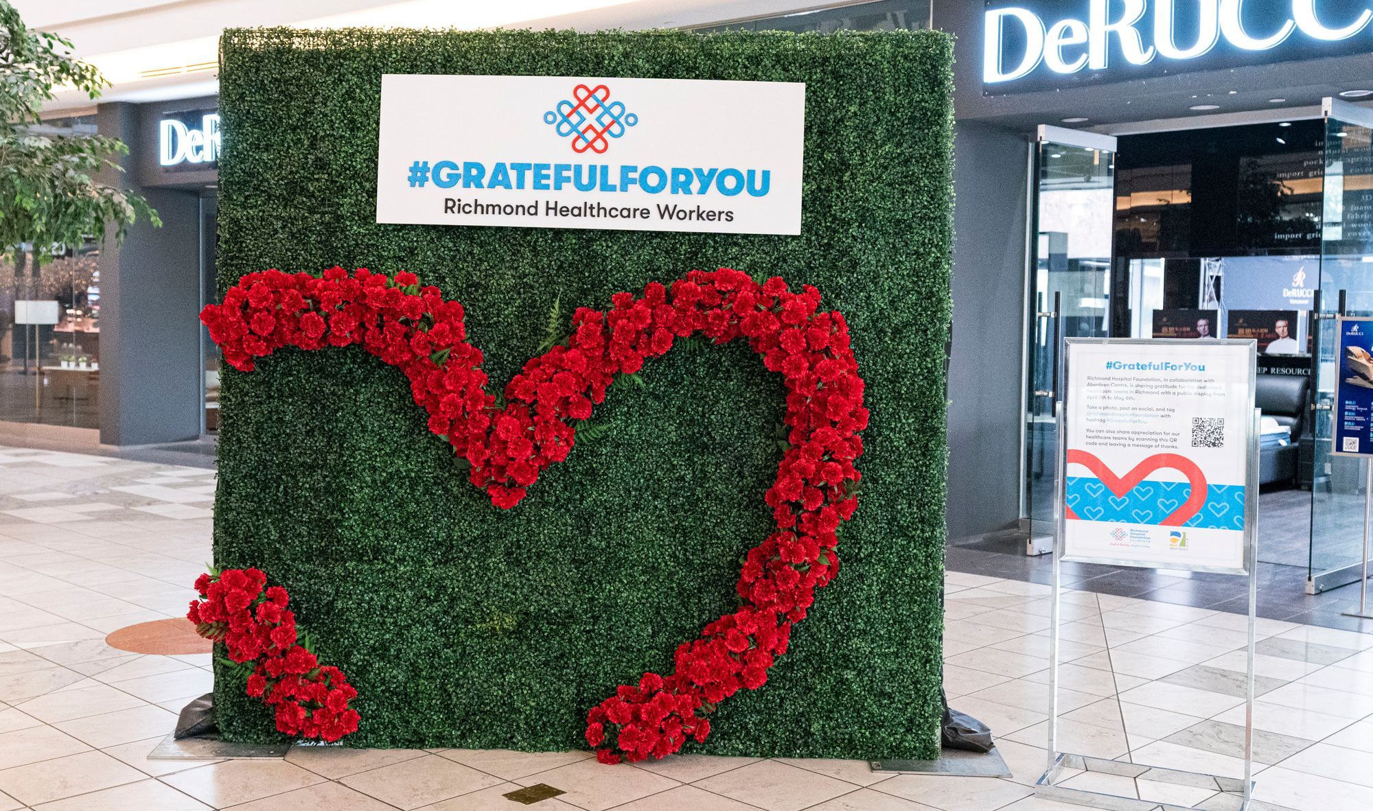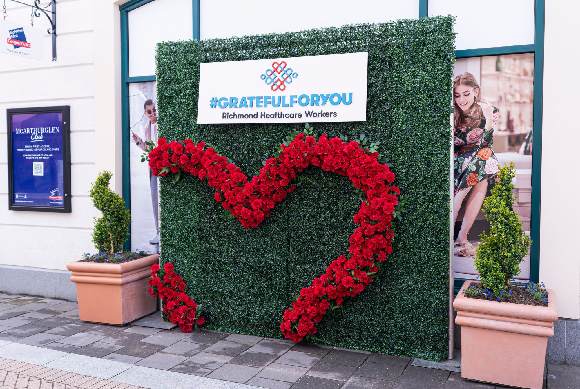 列治文医院基金会与时代坊和温哥华国际机场奥特莱斯McArthurGlen购物村携手合作,於四月期间在该两个商场内摆放致谢陈列布置,让公众有机会向列治文医护人员表达谢意。我们诚意邀请您齐来参与这次致谢活动,到访这两个地点拍照,并用主题标签 #GratefulForYou於社交媒体上分享。