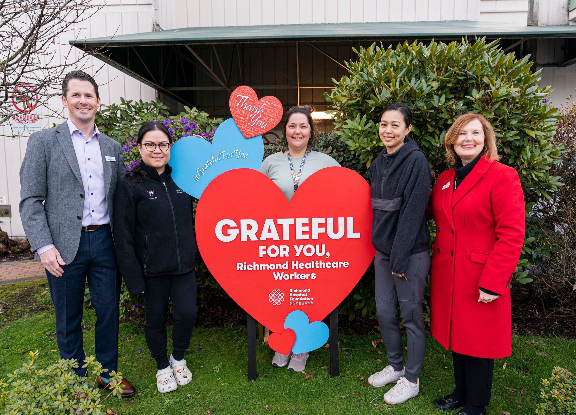 列治文医院基金会於清早在医院的员工入口处举行了欢迎仪式,基金会和温哥华沿岸卫生局的领导团队向员工致谢。为#GratefulForYou「感恩有您」活动而制的模型展品,将会永久竖立在列治文医院正门入口位置,以表扬医护人员的卓越贡献。