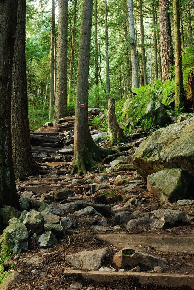 从松鸡山脚下,有一条徒步登山小道,顺着山势,穿越树林,蜿蜒向上,弯弯曲曲直达山巅。这就是著名也是深受当地人喜爱的松鸡山磨人小径。这条小道的英文名称为Grouse Grind Trail。 Grind一词,就是研磨、摩擦、磨碎的意思,用这样的词汇来命名一条登山小径,一定是有原因的。