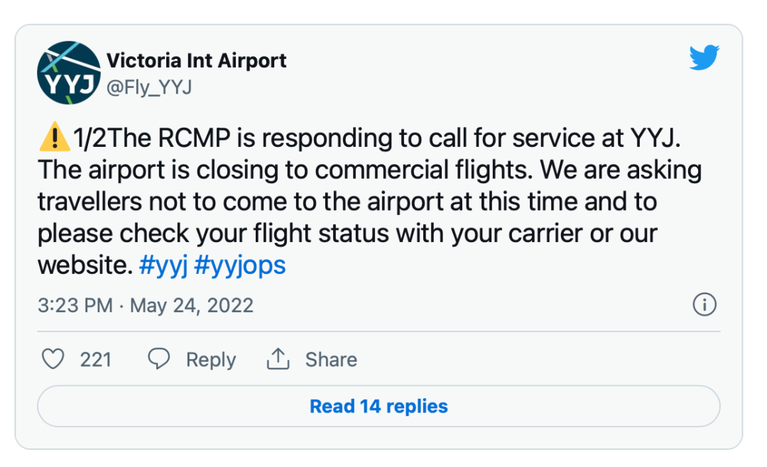 5月24日下午2点半至晚上8点,维多利亚国际机场被警方临时封闭,约20个商业航班被取消。