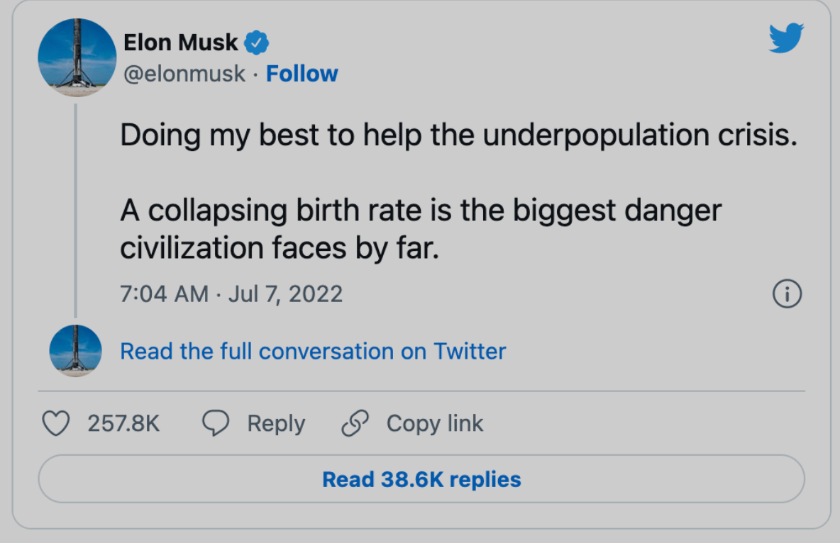 而马斯特本人则在推文中表示,“生育率下降是人类文明所面临的最大危机。”