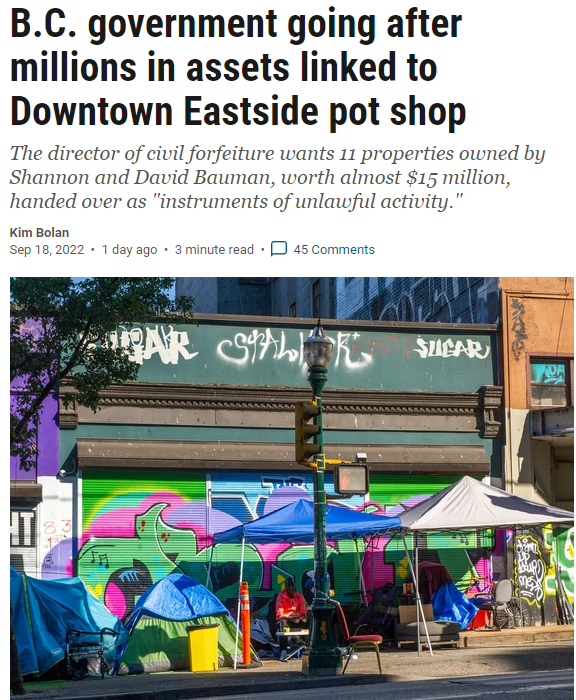 据Vancouver Sun报道,9月14日,BC省民事充公署署长提起诉讼称,Bauman夫妇自2010年起,在温哥华East Hastings街151号的店内非法销售大麻,并用所获利润购置了11处房产(总价值共计1,500万加元)。