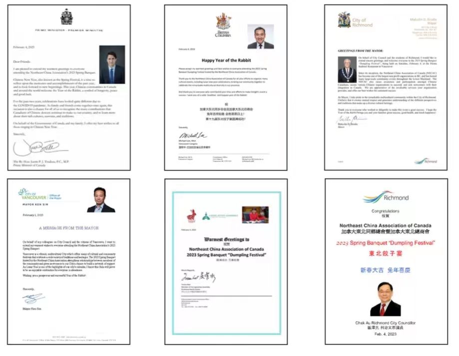 加拿大总理特鲁多、温哥华市长Ken Sim、BC省议员李耀华、屈结冰、列治文市长马保定及议员区泽光政府官员发来的贺电,祝愿饺子宴圆满成功。