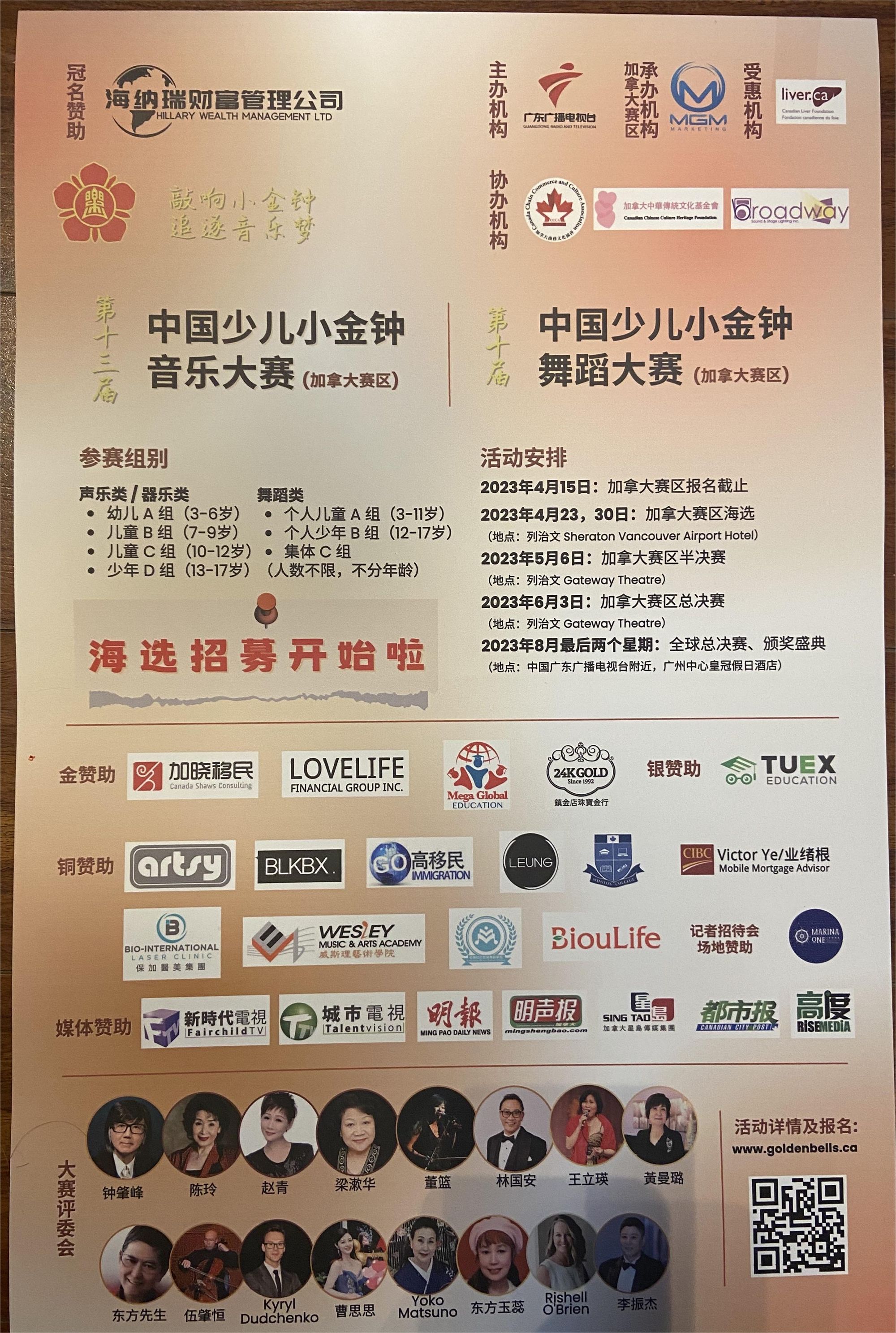 预祝第十三届中国少儿小金钟音乐大赛和第十届中国少儿舞蹈大赛加拿大赛事圆满成功!预祝每一位参赛选手敲响小金钟,赛出好成绩,追逐音乐梦!