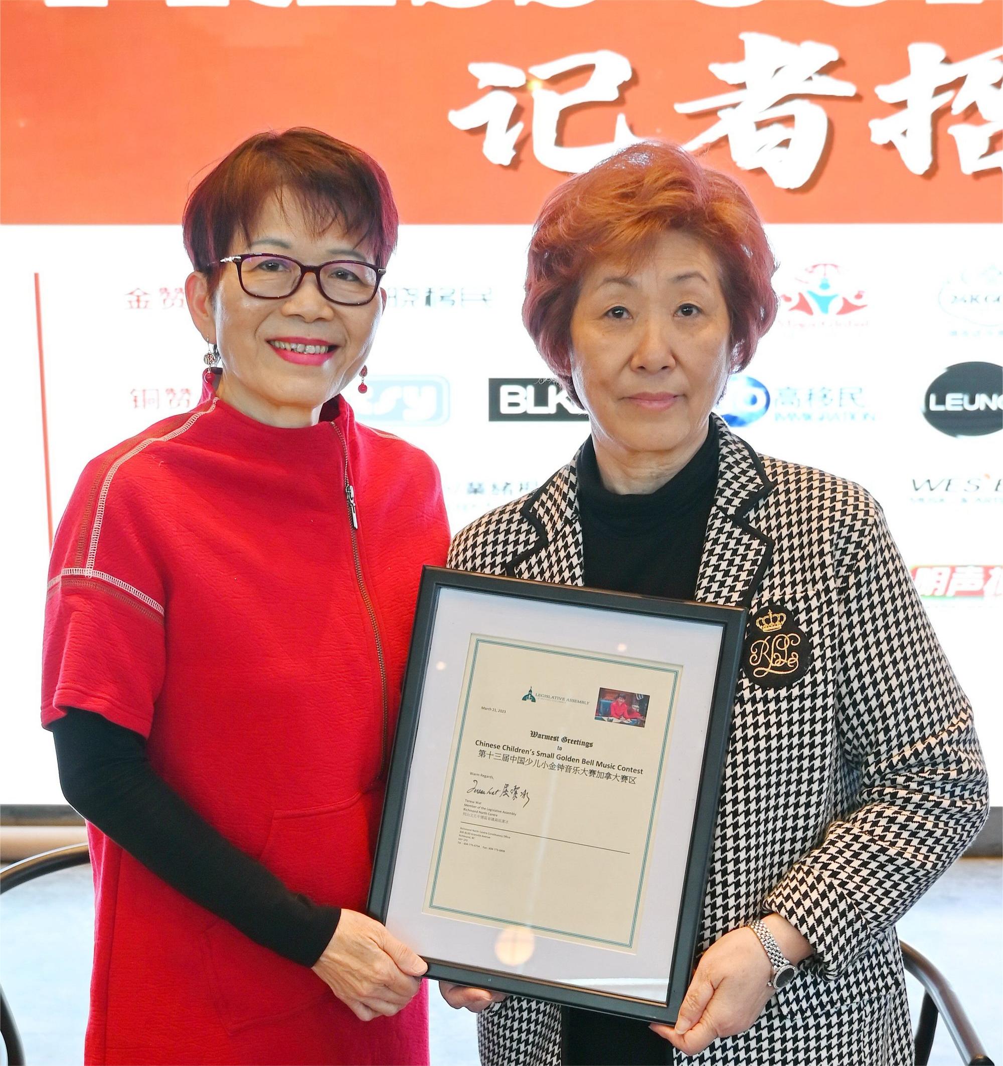卑詩省议员屈潔冰致辞,预祝本次大赛圆满成功,并向周徐慧蘭頒發感謝狀。