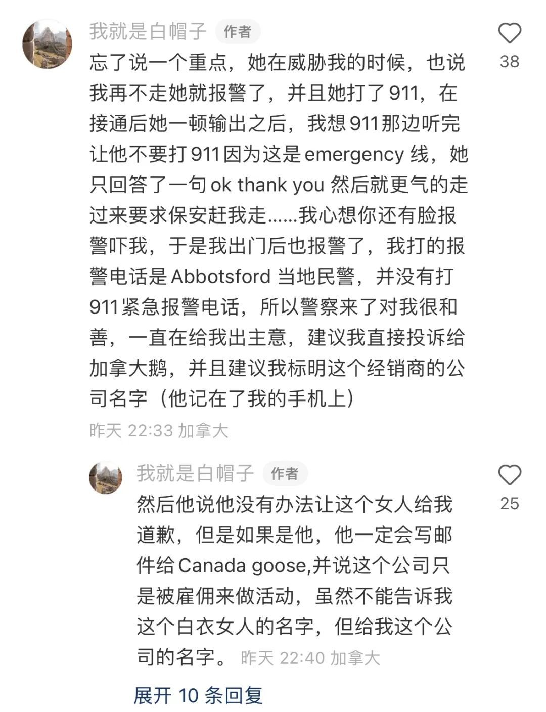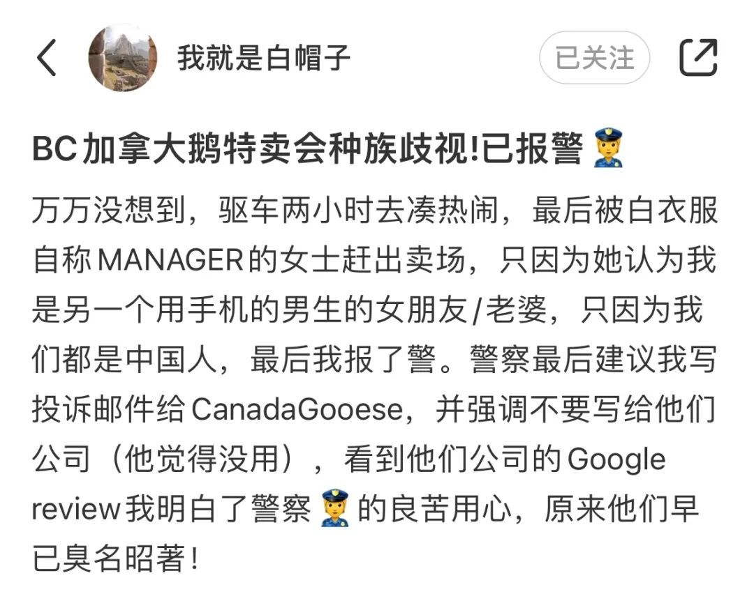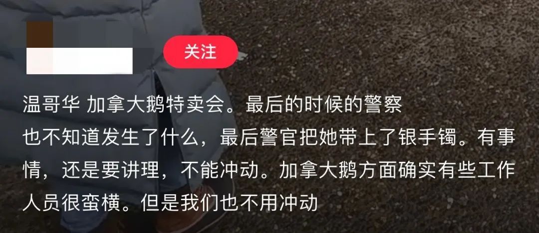 “警察说没有办法让这个女人给我道歉,但如果是他,一定会写信到加拿大鹅去投诉。”