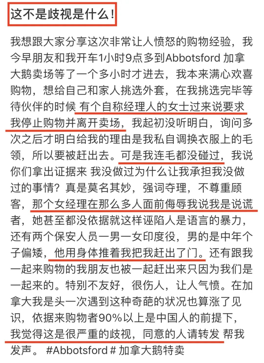 【加拿大乐活网lahoo.ca 王大力综述】 2月10日-12日,加拿大鹅在大温阿伯茨福开仓特卖,吸引了不少顾客。然而据网友爆料,多名华人在现场遭到歧视,被粗鲁驱逐,甚至警察都来了……
