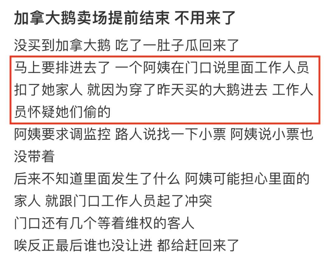 “当时我正在卖场里挑衣服,前面一位男生因为用手机而被要求离开卖场(加拿大鹅特卖会规定现场不许使用手机)。男生解释说,没看到标识说不允许打电话,但卖场工作人员仍然非常粗鲁的勒令该男生离开。