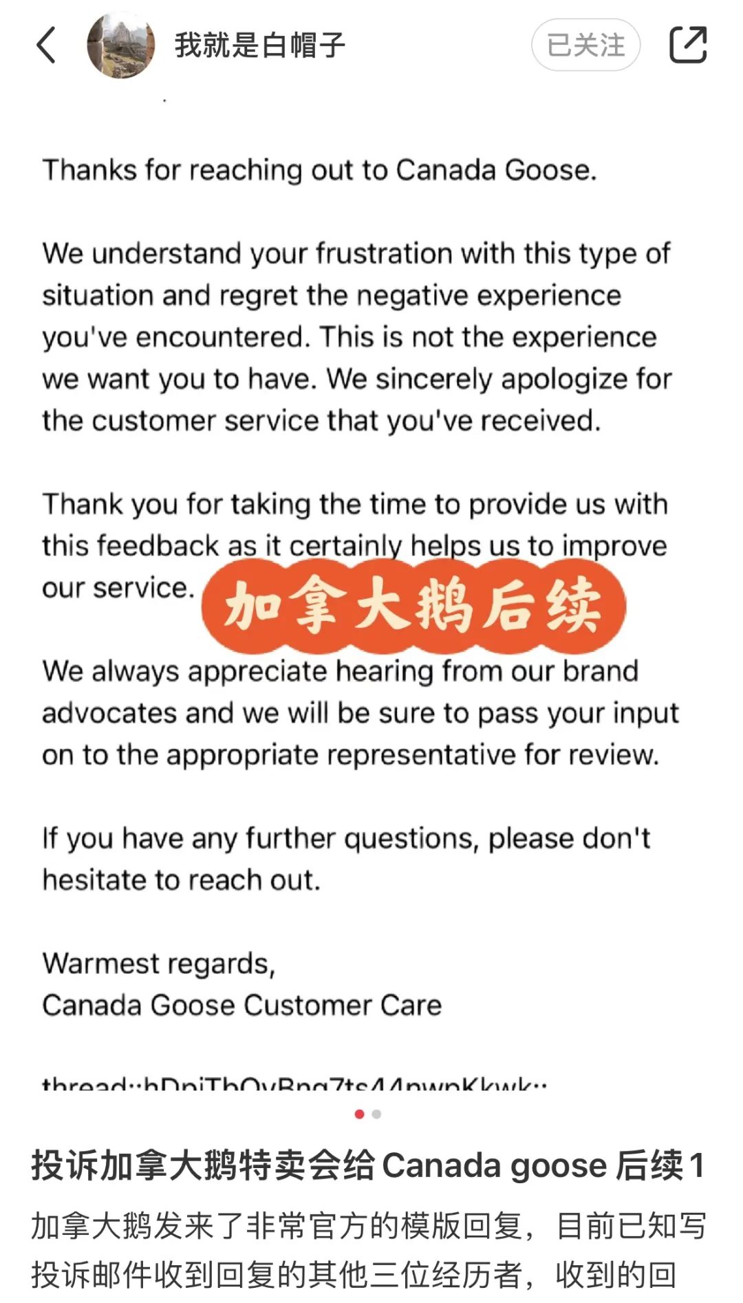 之后,有多名遭遇歧视驱逐的华人都写邮件到加拿大鹅去投诉,结果却只得到了非常官方的模版回复。