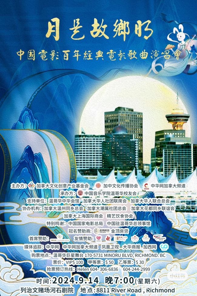月是故乡明—-中国电影百年经典歌曲演唱会,将于9月14日晚7点在列治文河石赌场剧院举行,届时专业的歌唱家们将演唱中国电影中精彩的主题歌曲,既有《让我们荡起双浆》《这世界这么多人》童声合唱、侨界合唱《送别》还有独唱《花儿为什么这样红》《我爱你中国》《船工号子》《如愿》《草原之夜》《绒花》等经典的电影插曲,相信能为大温地区的观众带来全新的视听盛宴。
