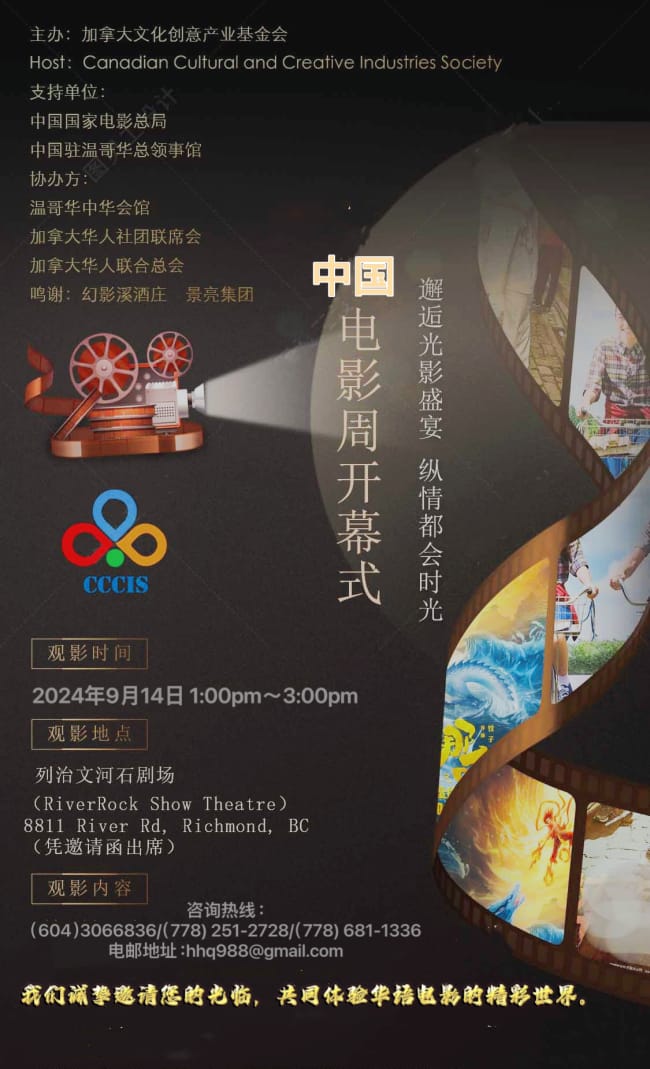 发布了2024加拿大华语电影周将于9月13-17日在温哥华的RIO影院隆重举行,届时将连续播放8部优秀的华语电影作品及《月是故乡明—-中国电影百年经典歌曲演唱会》。此次电影周活动旨在为观众带来一场多样化和精彩纷呈的电影盛宴,展示华语电影的独特魅力和深厚文化底蕴。