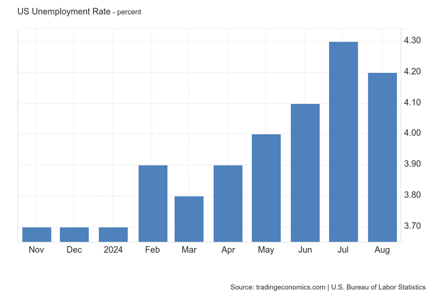 除了通胀放缓,美国劳动力市场的疲软同样推动了美联储的大幅降息。2023年底以来,美国失业率从年初的3.5%升至4.2%,反映出企业投资和消费支出的放缓,以及全球经济的不确定性加剧的影响。在高利率环境下,企业面临融资成本上升,进而减少招聘和扩展计划,这种情况尤其体现在制造业和科技领域。通过大幅降息,美联储希望降低企业借贷成本,刺激投资,并在一定程度上缓解失业率的上升趋势。这也为未来的经济复苏奠定了基础。