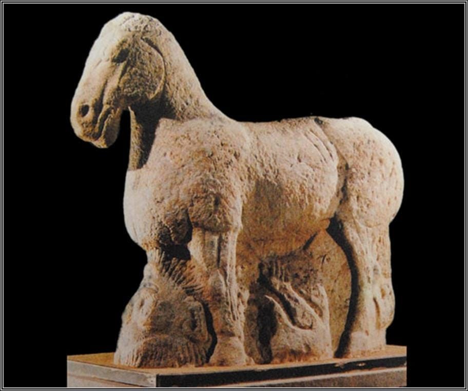 但是我想指出的一個問題是,中國特别注重用「線形手法」,但在造型藝術採用「團塊形手法」方面都有優秀傳統。從考古史料看,立體形態石雕在中國具有十分悠久的傳統歷史,中國古代當黄河流域孕育著華夏文化的時候,先輩藝術家就與先人景仰的動物石雕藝術結下了不解之緣。西漢時代,陝西興平霍去病墓前的古獸石雕,這是典型的「線面結合」範例,造型以形象雄渾拙樸為特徵,捨去了任何瑣碎的肌理和無關緊要的細節,而代之以概括洗練的體積,遠遠看去如頑石一樣的石雕與莽原大漠相交融,近前揣摩,含蓄誇張的陰線刻劃,變形洗練的處理手法,線面融合,相互襯托,突出了表現對象的自然本質。