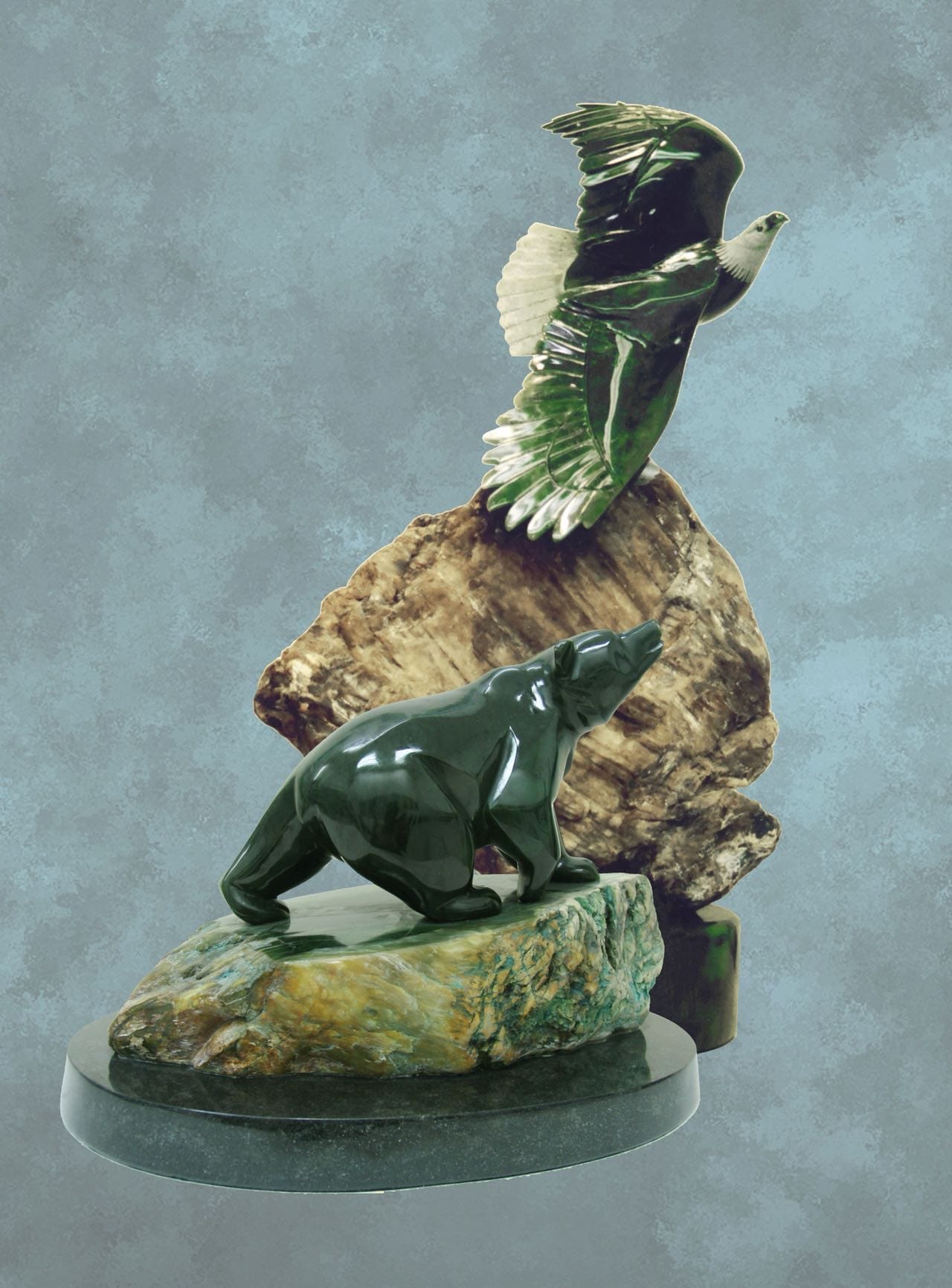 北美自由寬鬆的社會生態、大自然景觀、人們美學觀念,為藝術發展營造了多元文化廣為接受的人文氛圍,也為野生動物玉雕創作提供了無限寬廣的施展空間。確實,北美生活讓我找到了接踵而來的靈感,讓我久索心頭的感悟產生裂變,發酵己久的創作構想終於找到了突破口。我有強烈的表現慾望,選用加拿大玉石,雕琢那種雄渾大氣、符合北美人品味的野生動物形象。诚然,這些都是促使我不斷投入創作的內在張力與动力。