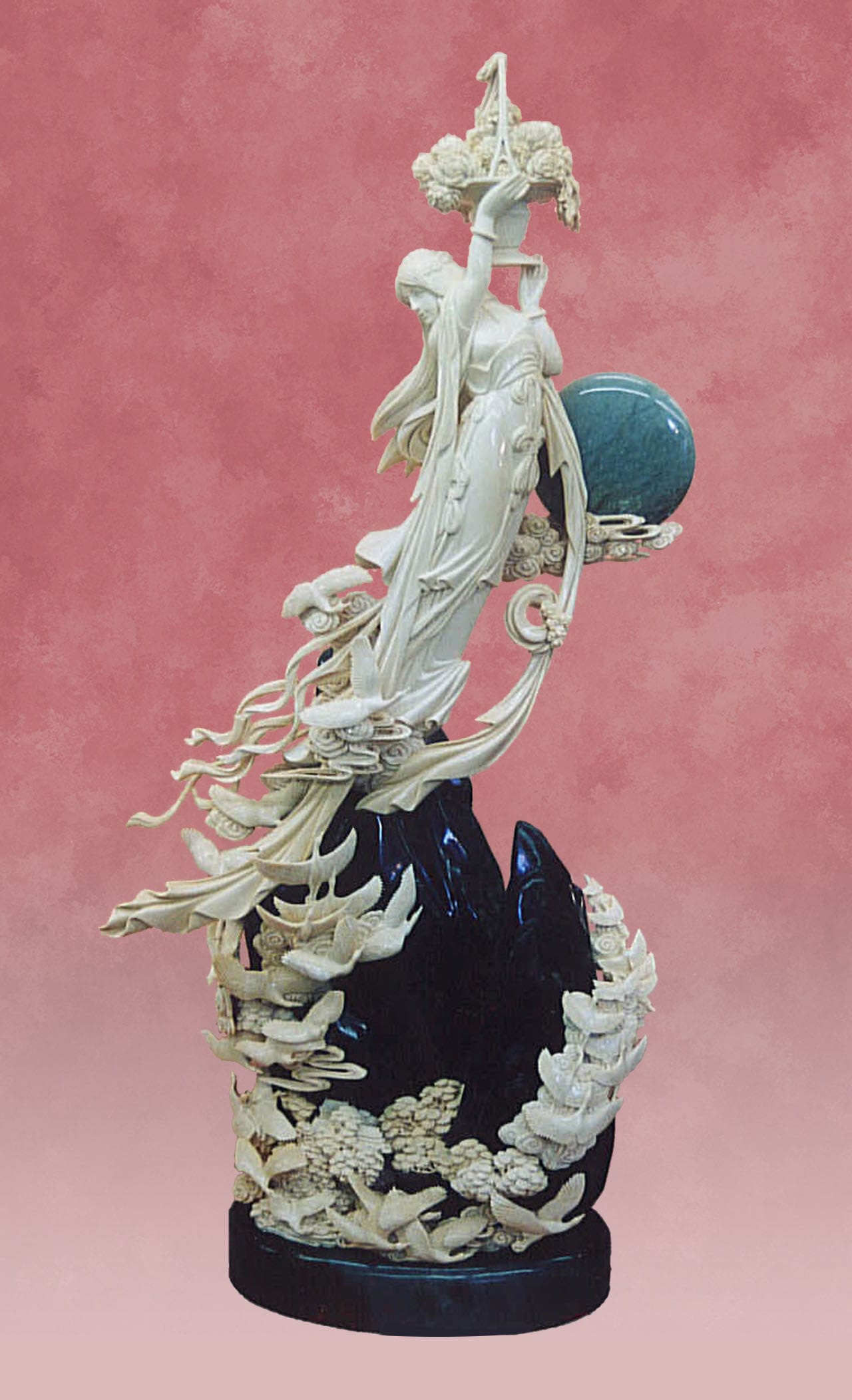 期間,我很幸運地先後同加拿大最顶級的两位玉雕名家,David Wong, Lyle Sopel.(1987年國際地理雜誌有詳細介紹)與其共事成為合作夥伴。所以,我後來的藝術眼界和經驗是在學習東西方文化中提高的,我的藝術進步是站在高人肩膀上取得的。在這樣特别的創作環境中,多元文化元素互鉴融合,東西方造型方法和藝術技巧互補,高手和高手在一起切磋交流,靈感火花相互碰撞,使很多意想不到的高端藝術精品在我手中頻頻問世,萝寐以求的境界追求成真。