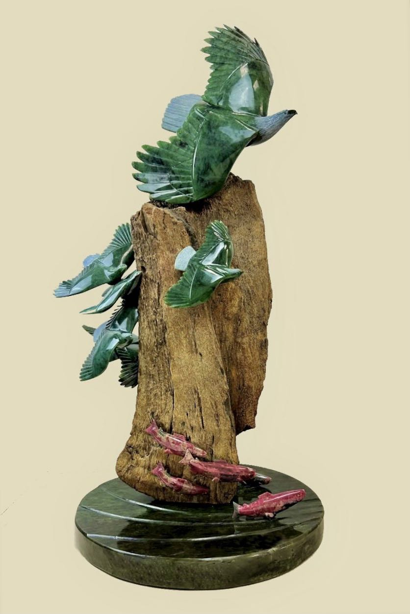 溫哥華所在的不列顛哥倫比亞省(B.C.)盛產玉石,而且取之不盡。你作為一位來自中國的雕刻大師,把從東方帶來的藝術神韻注入到加拿大玉石之中,創造了一種文化和藝術新生命。前一個時期我去美國阿拉斯加,原想在回程時驅車三十七號公路,那是B.C.省盛產玉石的地方,想領略一下加拿大玉石產地的風光,但由於山火威脅,道路不暢,也就沒能如願。最近,聽說你的《玉橋》英文版出版,多了一本向加拿大主流社會推介解讀北美玉雕藝術的專著,這是很值得慶賀的。所以我想利用這個機會,就玉雕藝術的幾個問题與你進行深度對話探討。事實上,你幾十年的整個藝術生涯本身就很精彩,能否先從這方面談起。