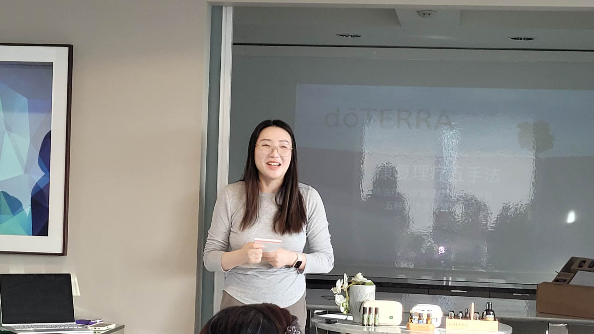 11月18日下午,应列治文Avanti社区居民组织的阿凡提运动休闲俱乐部的邀请,美国著名的多特瑞精油公司温哥华健康团队的养生专家们来到社区,举办了一场别开生面的健康美容养生沙龙。近30名俱乐部成员与社区居民参加了聚会,认真聆听和亲自体验了多特瑞精油的奇妙功效。