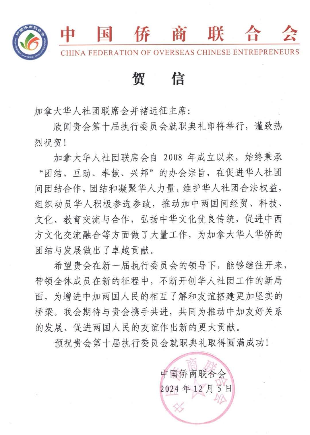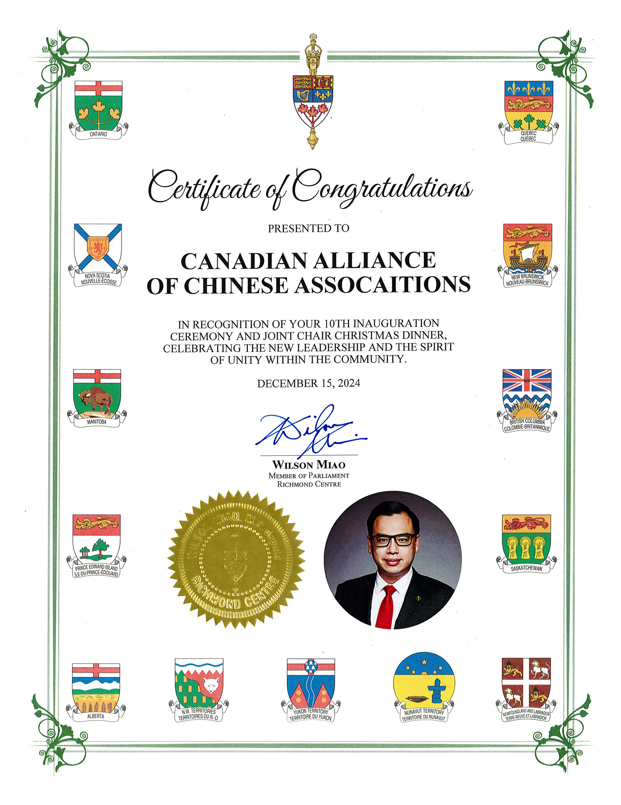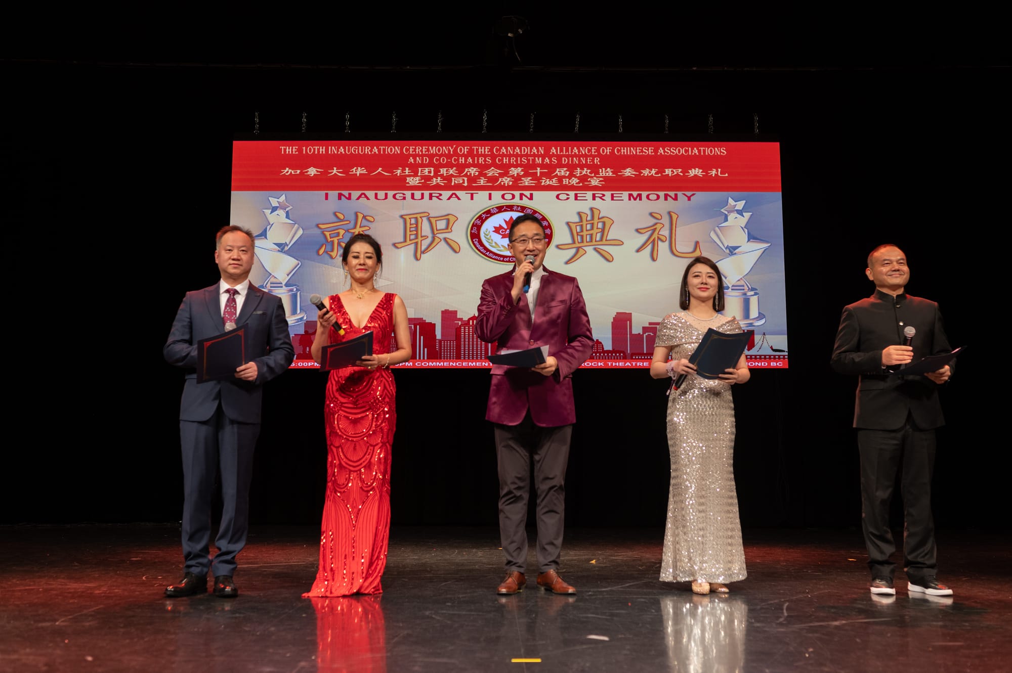 【高度传媒首席记者 王子游报道】12月15日傍晚,华灯初上,夜色迷人。列治文河石娱乐度假酒店宴会大厅灯火辉煌,热闹非凡。来自大温各地的数百名华人汇聚一堂,庆祝加拿大华人社团联席会第十届执监委就职典礼隆重举行。加拿大政府三级政要和本地众多华人社团、以及中国侨商联合会等纷纷发来贺电,对本届执监委就职表示热烈祝贺(附后)。