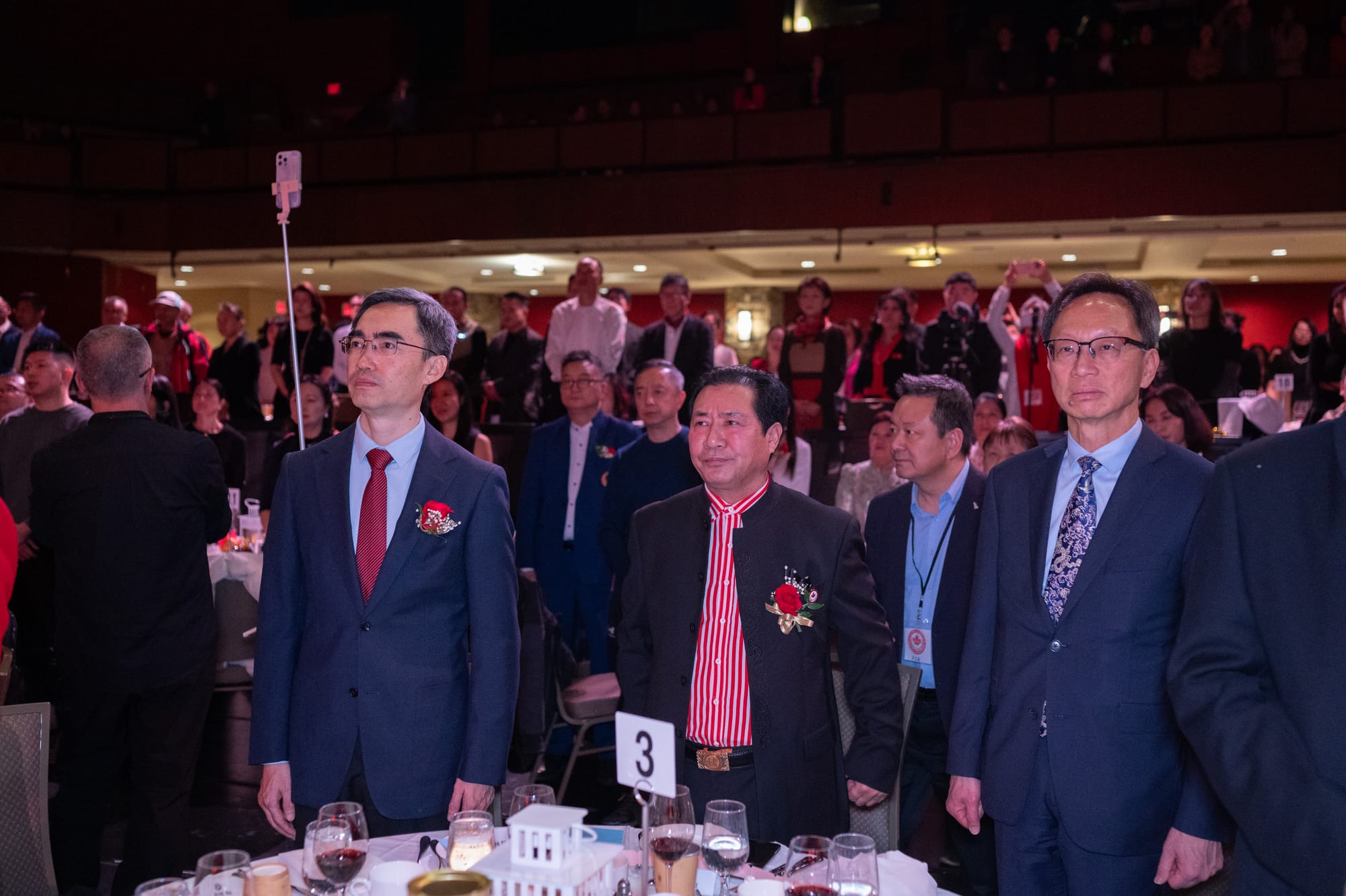 全体起立,高唱加中两国国歌。
