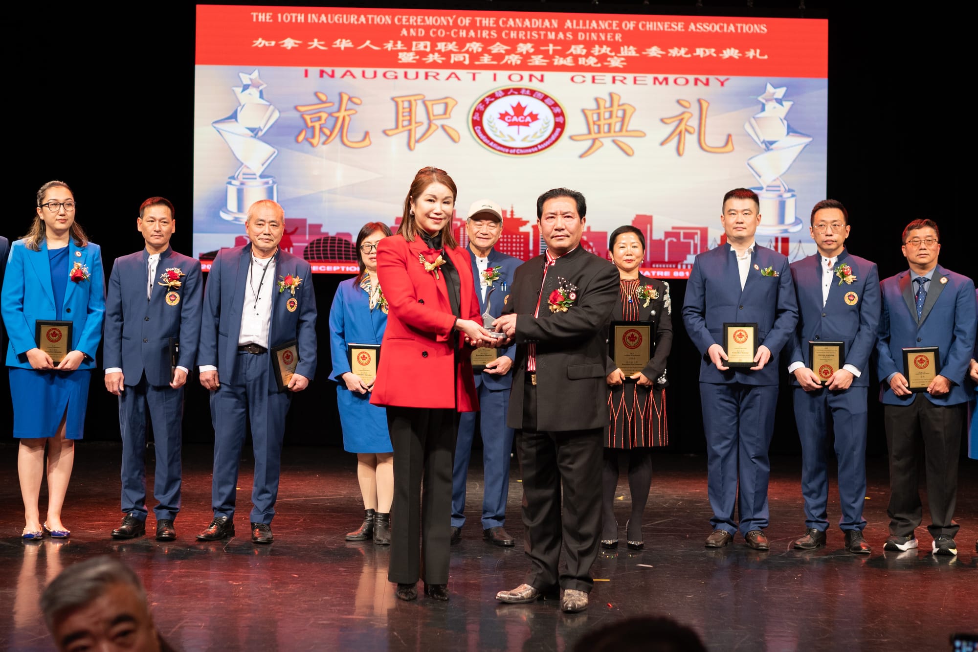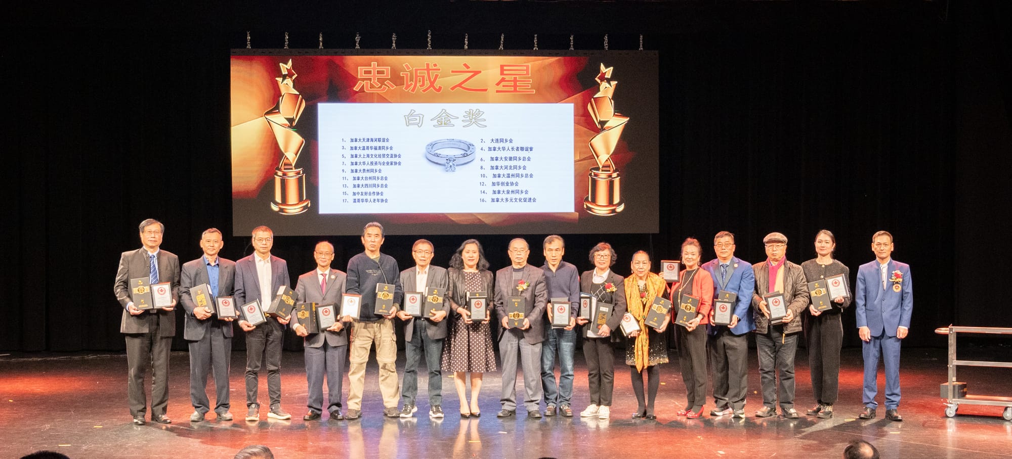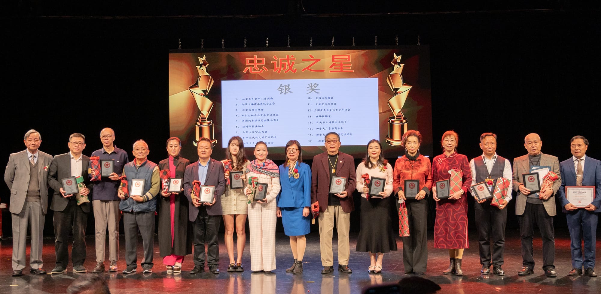 接下来是颁奖环节:由新当选的第十届名誉主席魏秀鹏,刘静,任大伟, 梓霖,陈建国,严丹红和傅维维上台,为在华人社区服务中做出杰出贡献的会员单位(共同主席)代表颁发“忠诚之星”表彰证书和奖品: