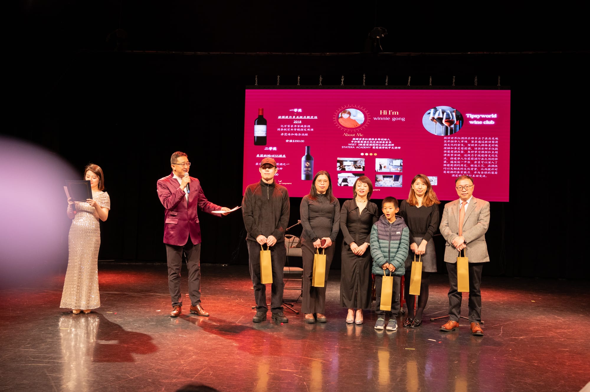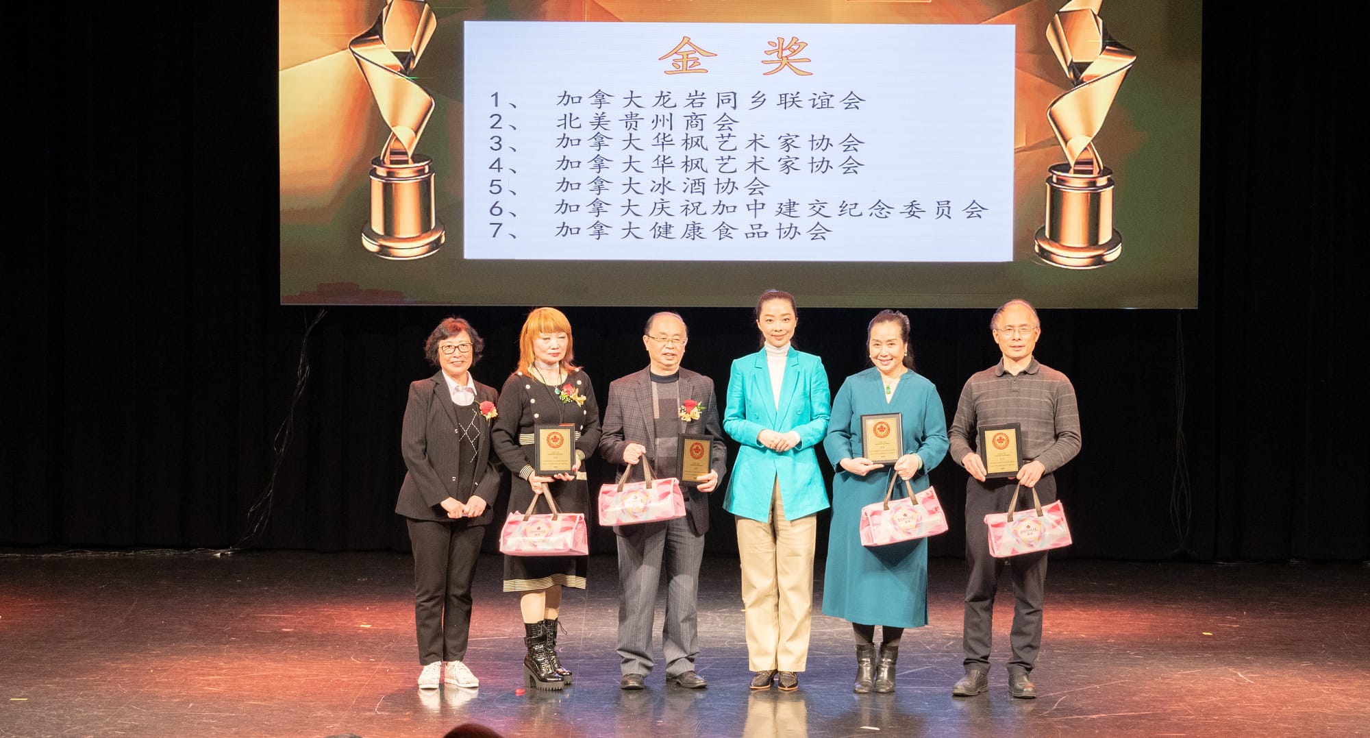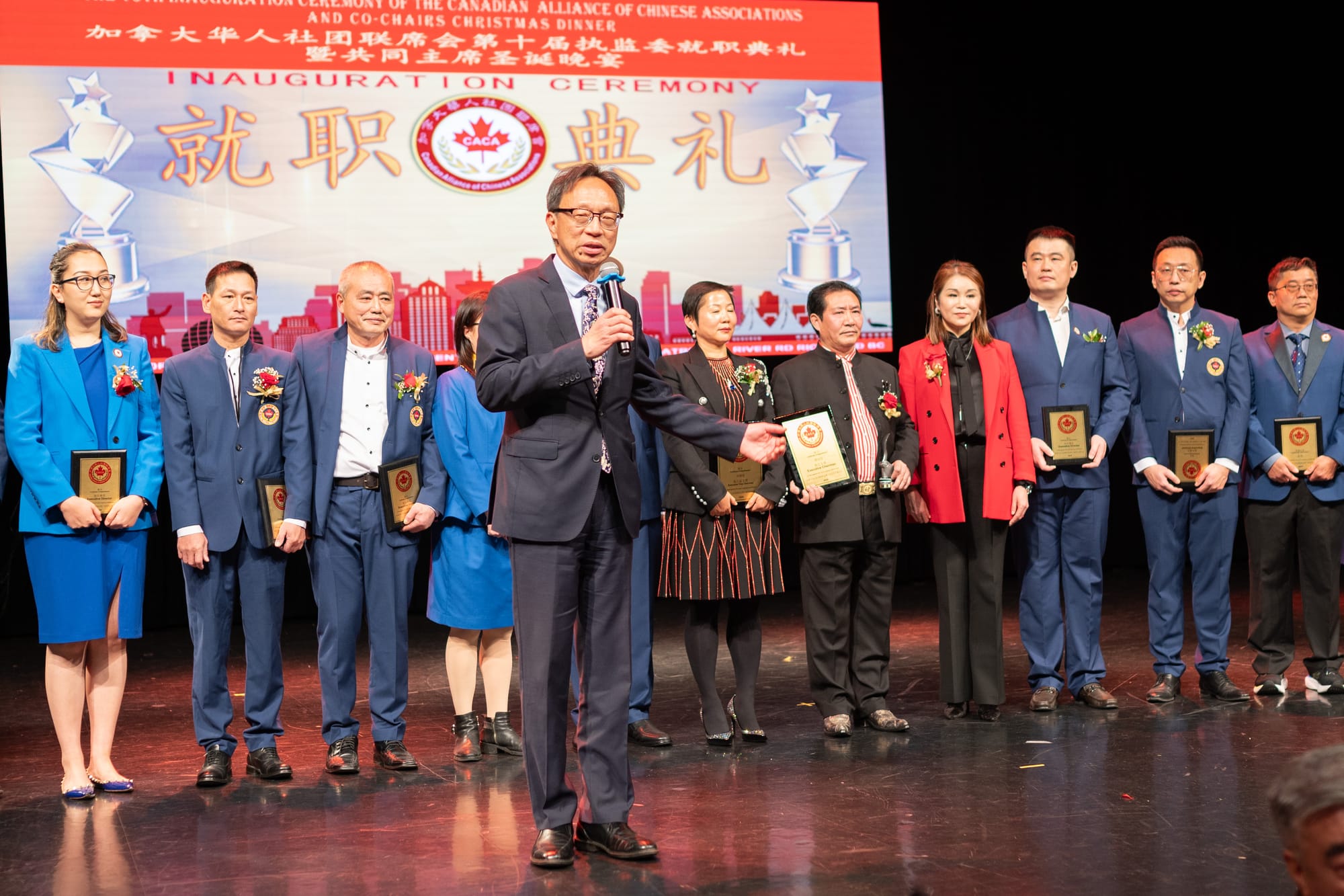 接下来是颁奖环节:由新当选的第十届名誉主席魏秀鹏,刘静,任大伟, 梓霖,陈建国,严丹红和傅维维上台,为在华人社区服务中做出杰出贡献的会员单位(共同主席)代表颁发“忠诚之星”表彰证书和奖品: