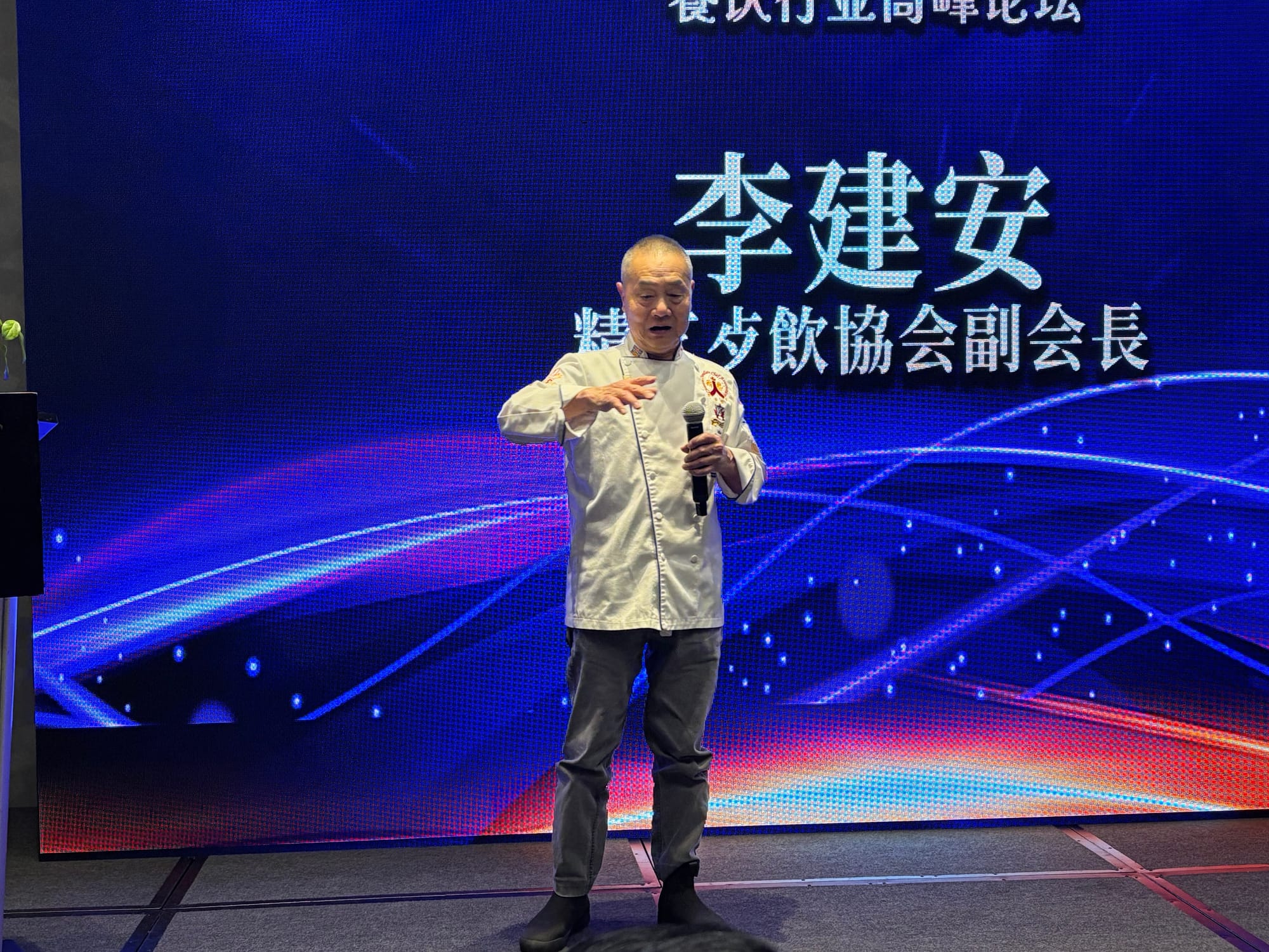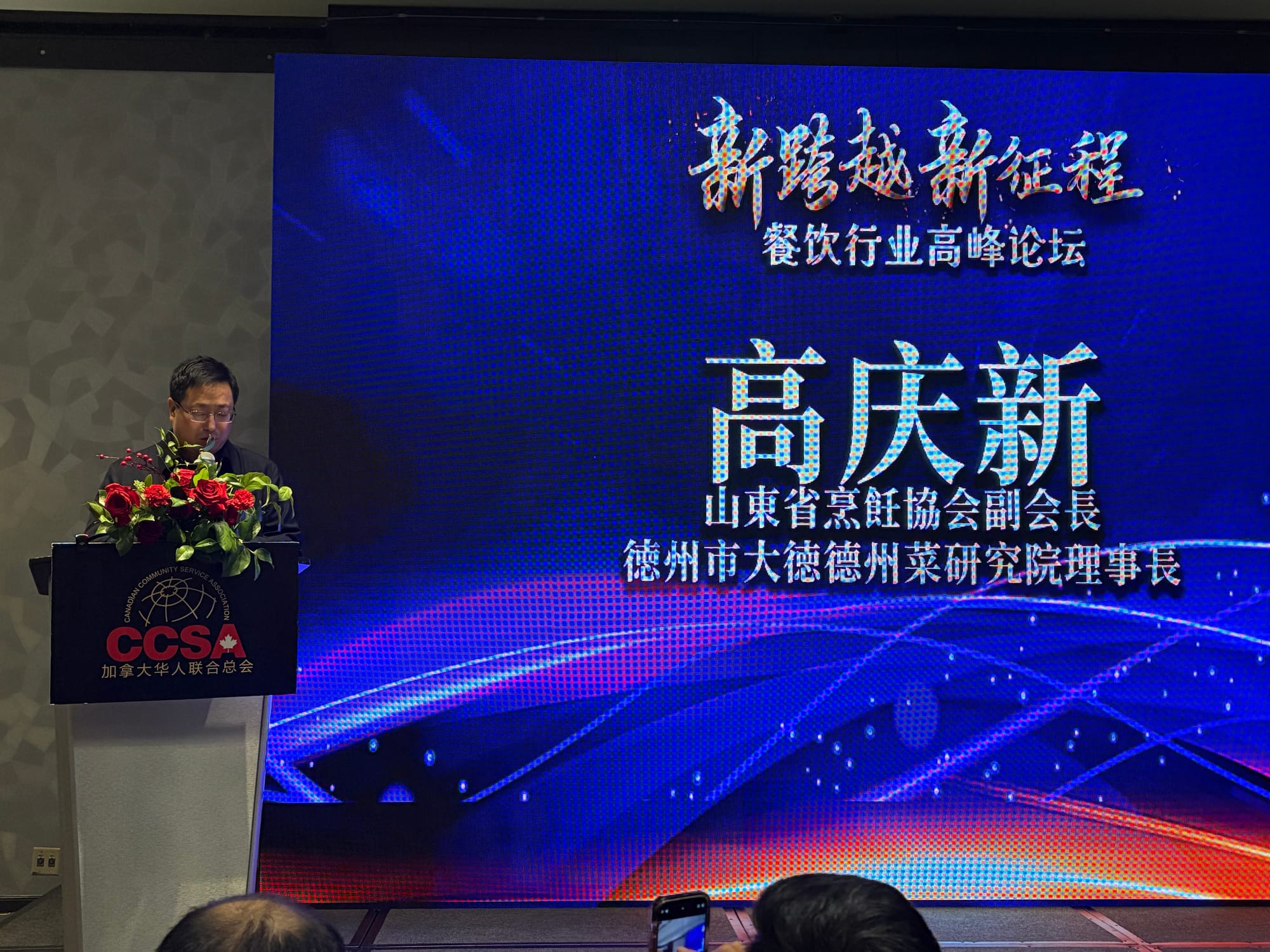 山东省烹饪协会副会长、德州市大德德州菜研究院理事长高庆新发言。他首先向大家介绍了世界中餐业联合会组织:该会是1991年经中国政府批准成立,致力于世界中餐业发展的国际性组织,由全世界各个国家和地区从事中餐服务、中餐理论研究、中餐咨询以及参与相关产业的企事业单位、社会团体和个人自愿组成,总部设在中国北京。世界中餐业联合会秉承弘扬中华优秀饮食文化,促进全球中餐繁荣发展。业务涵盖国际交流、教育培训、理论研讨、赛事展览、美食节庆、品牌培育、媒体宣传等多个领域,会员遍及五十多个国家和地区。自成立以来,世界中餐业联合会在弘扬中华饮食文化,推动民间国际交流,传承创新烹饪技艺,培养餐饮专业人才,提升中餐业国际地位等方面做出了卓有成成效的工作。