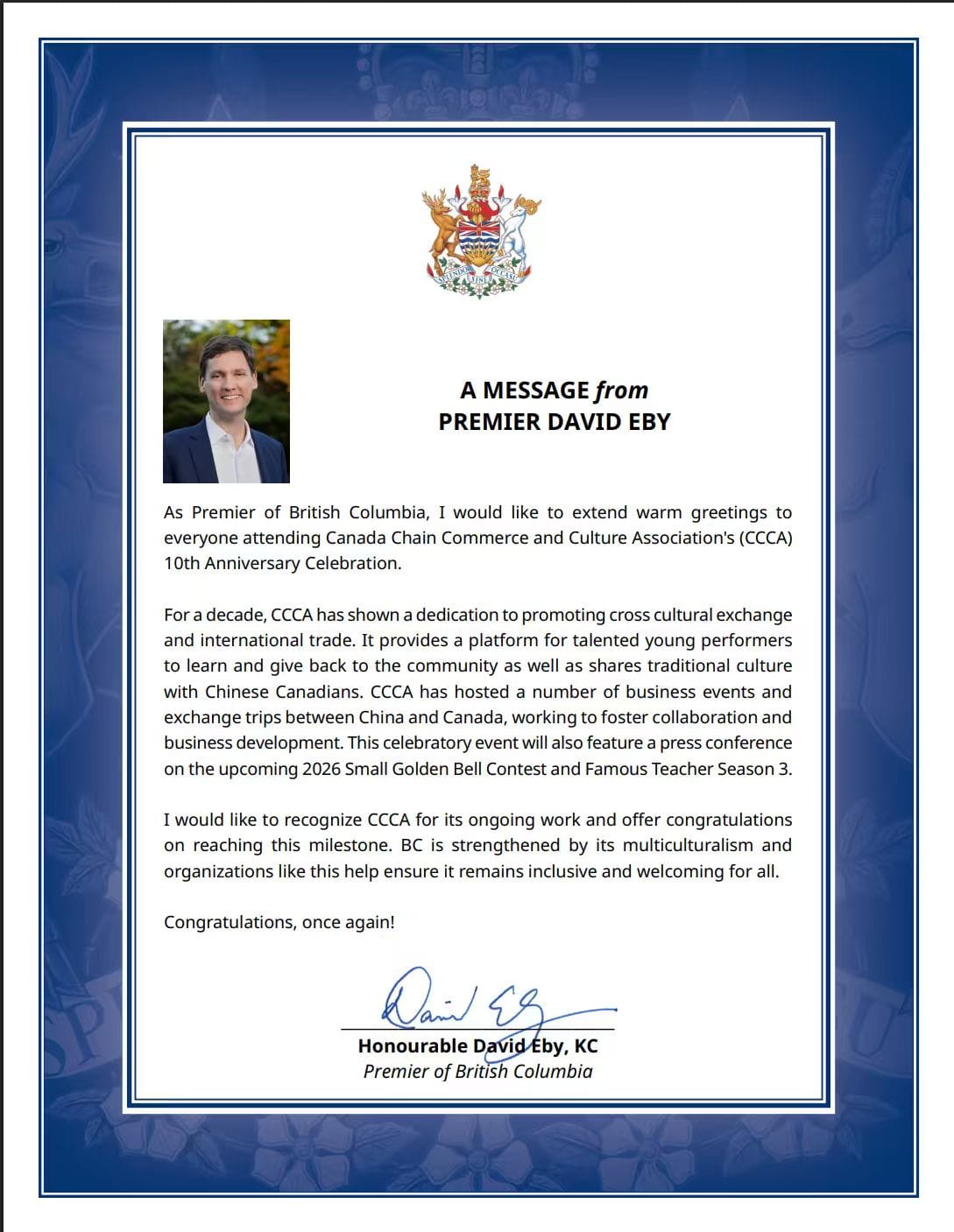 BC省长David Eby 发来的贺电。