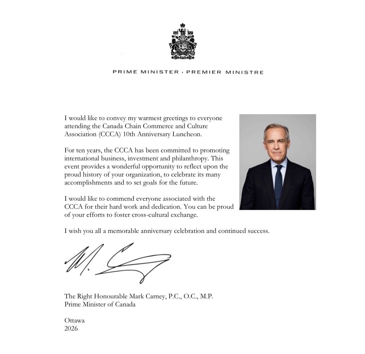 加拿大三级政府非常重视加拿大商务文化协会 成立十周年暨2026小金钟音乐大赛及名师有高徒第三季温哥华站的新闻发布会的活动,联邦政府总理卡尼发来了贺电。